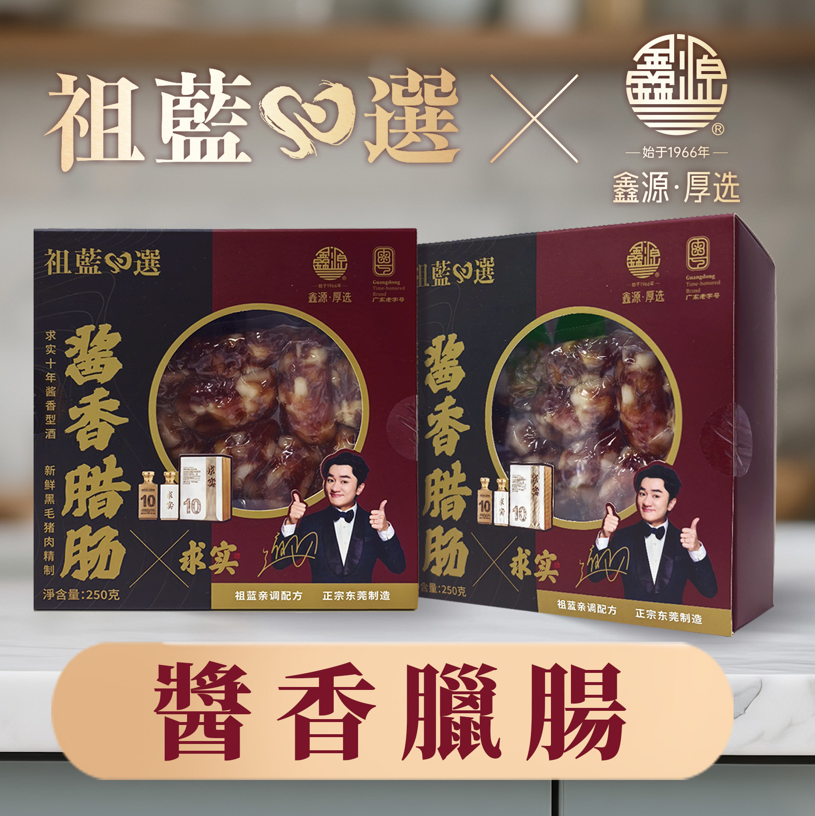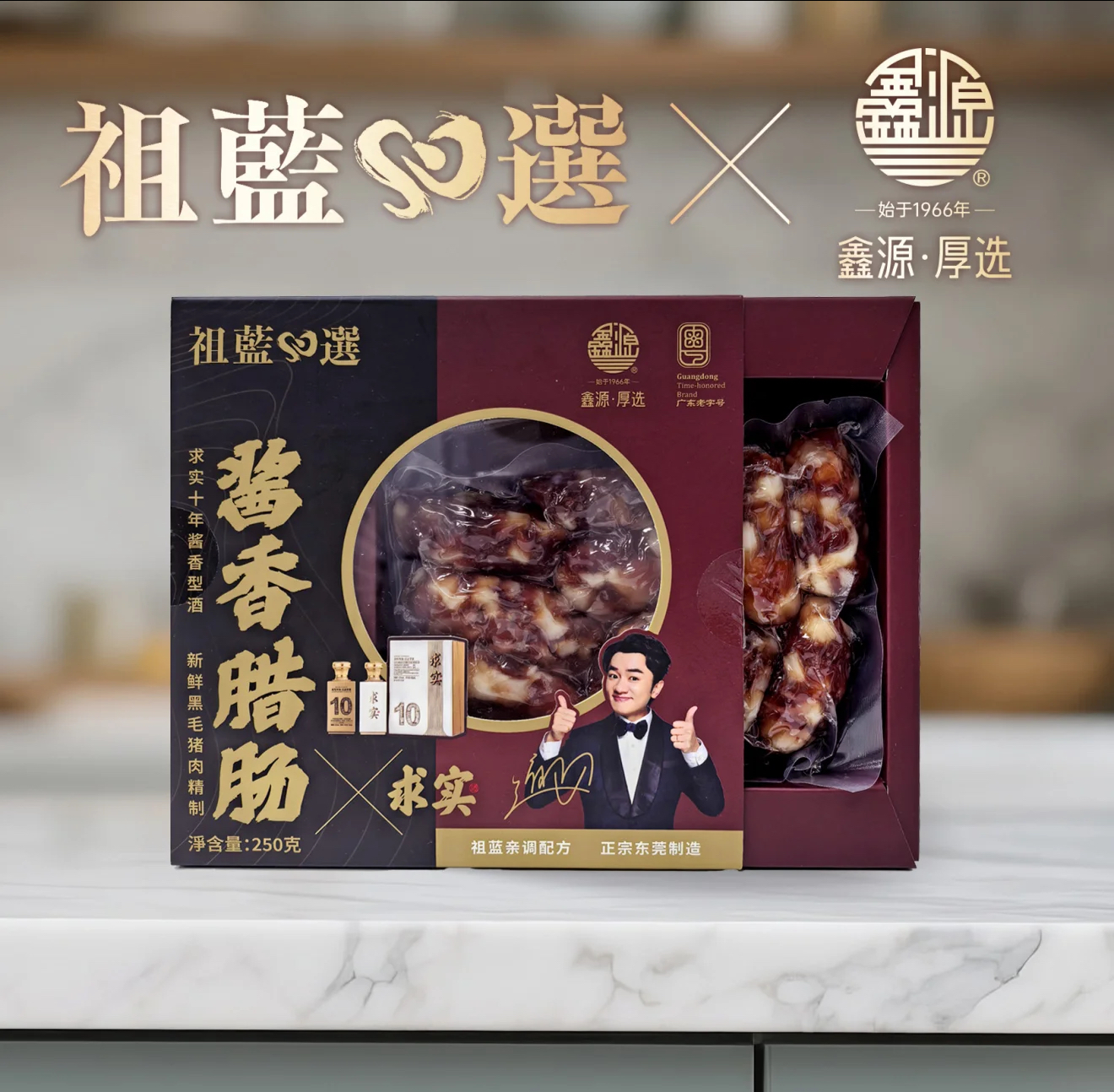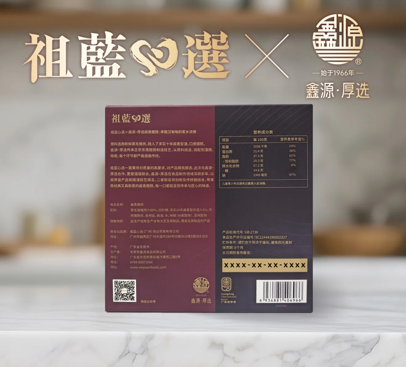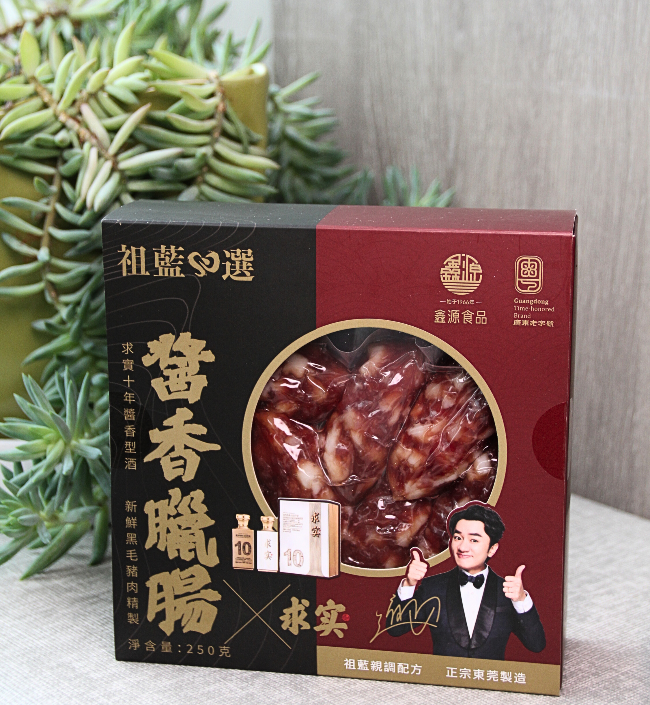 祖藍心選 × 鑫源.厚選醬香臘腸:承載沉甸甸的家鄉濃情 原料選用新鮮黑毛豬肉,融入了求實十年醬香型酒,口感細膩。 鑫源.厚選傳承正宗東莞臘腸製造技藝,從原料挑選、調配到灌腸、晾曬,每個環節都嚴格遵循傳統。東莞獨特氣候條件為臘腸晾曬提供天然優勢,自然風乾過程讓臘腸慢慢濃縮風味,形成恰到好處的口感。 祖藍心選一直秉持對品質的高要求,對產品精挑細選。此次與鑫源.厚選合作,更是強強聯合。鑫源.厚選在食品製作領域深耕多年,以高品質產品和精湛技藝聞名。二者聯名將創新及傳統相結合,帶來既經典又具新意的醬香臘腸,每一口都能呈現傳承與匠心的味道。