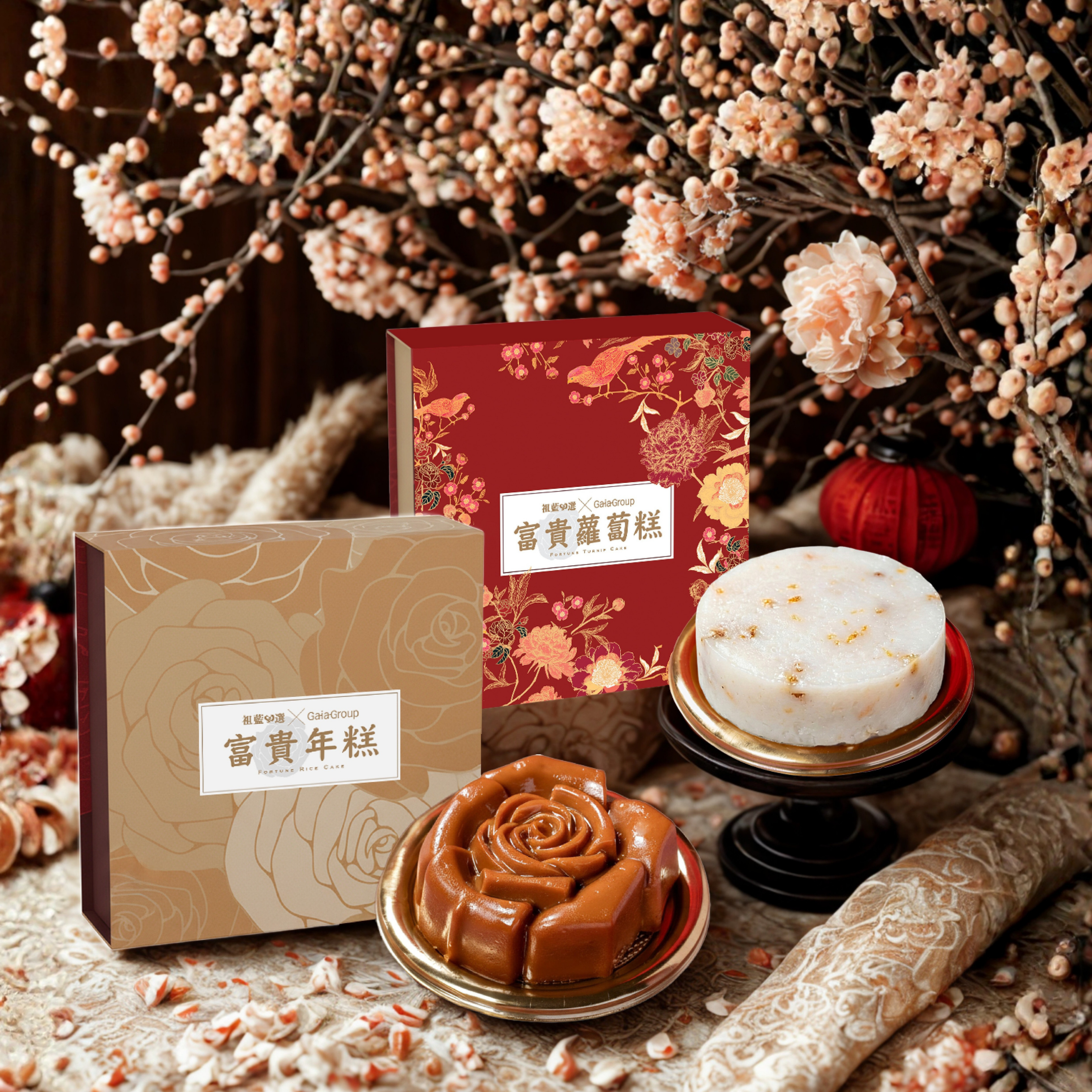 【富貴糕點禮盒】,嚴選兩款賀年經典—王祖藍妹妹秘製的蘿蔔糕與設計的玫瑰花造型年糕。從內在配方到外在禮盒,皆注入祖藍一家的匠心與美學,是一份飽含心意、融合傳統與創意的誠意佳禮。