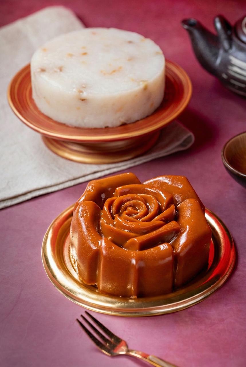 富貴年糕:同樣由祖藍妹妹巧思設計,創新立體玫瑰花造型,寓意「花開富貴」,為傳統年糕增添藝術美感與食用樂趣。質感軟糯煙韌,米香純正自然。